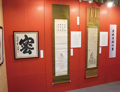 会場には各ジャンルの作品に加え、清水寺住職・森清範貫主や歴代の清水寺住職による貴重な書が特別展示されました。幕末期に尊王愛国の思想を志した勤王の僧、月照上人の作品は、智慧の威徳を示す獅子に乗った文殊菩薩図で、「良慶さん」として大衆に慕われた昭和の名僧・大西良慶和上の、鮮やかな聖徳太子像が描かれた画賛を展示。そして森清範貫主による、コロナ禍の世相を表した、「今年の漢字一字(2020年)」の《密》が展示されました。