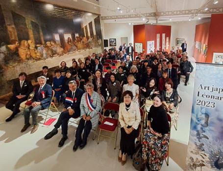 後期初日には、展覧会場内においてオープニング・セレモニーが開催されました。内覧会の後、夕刻よりレストラン「Aubergedu Prieuré」にてレセプション・パーティーが催され、料理人ステファン・ソウザン氏による風味豊かなルネサンス料理が振る舞われました。その後も、日本のアーティストによる多彩な作品と、レオナルドの代表作のレプリカを併設展示する試みで多くの来場者の方々が訪れ、記念ワインも購入希望者が出るほどの盛況ぶりだったそうです。作品をご覧いただいた皆様、誠にありがとうございました。
