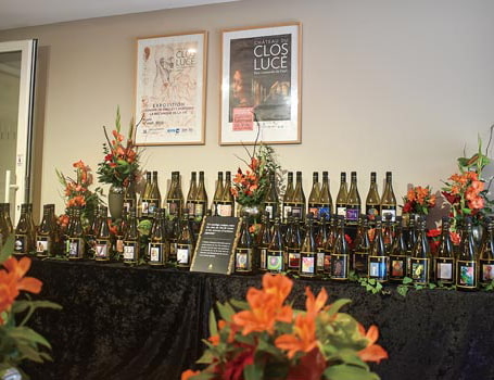 出展作品をラベルに配した記念ワインを展示